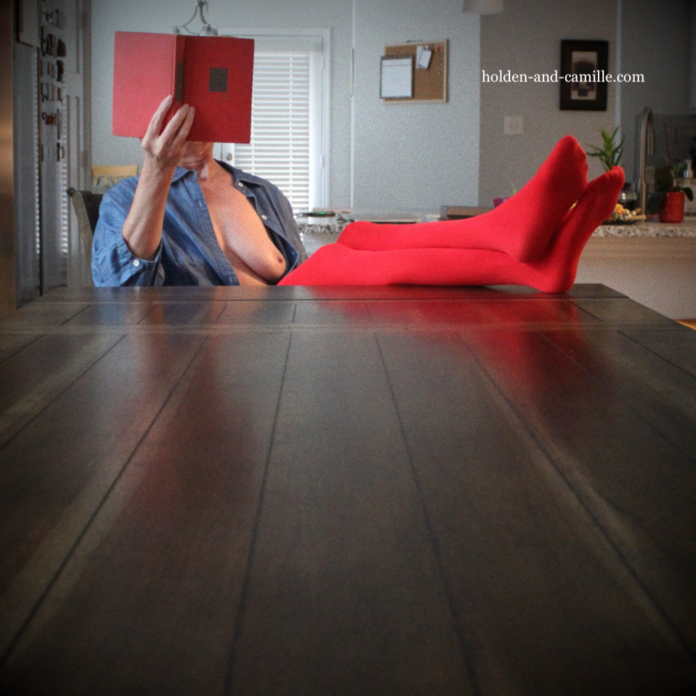 These photos are the “other idea Holden had in mind” for the long dining table, where he put the camera on the surface on one end and shot me on the opposite. They’re cropped, obviously, since there’s only so much naked wood that we wanted to include. (That’s what she said?) Over my shoulder is the back door, and the kitchen is immediately behind me — We’ve only shown one angle of it so far, so this might give a better perspective of the overall layout. ~C