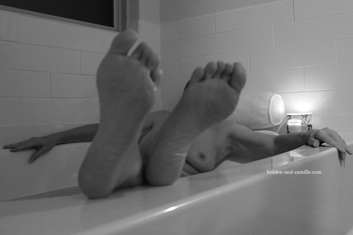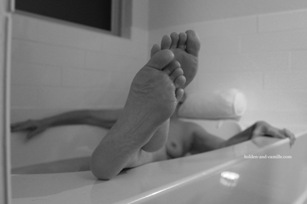 This is the next-to-last pairing that we’ll post from the August session and, coincidentally, it’s also the next-to-last idea that we shot that evening. In the top photo, I got closer to the artsy-fartsy vibe Holden was looking for, except for that death grip on the side of the tub with my left hand. I’d put too much bubble stuff in the tub and my ass was slipping side to side, you see. This problem was corrected with the strategic placement of a washcloth underneath me, which accounts for the more relaxed pose in the second shot.