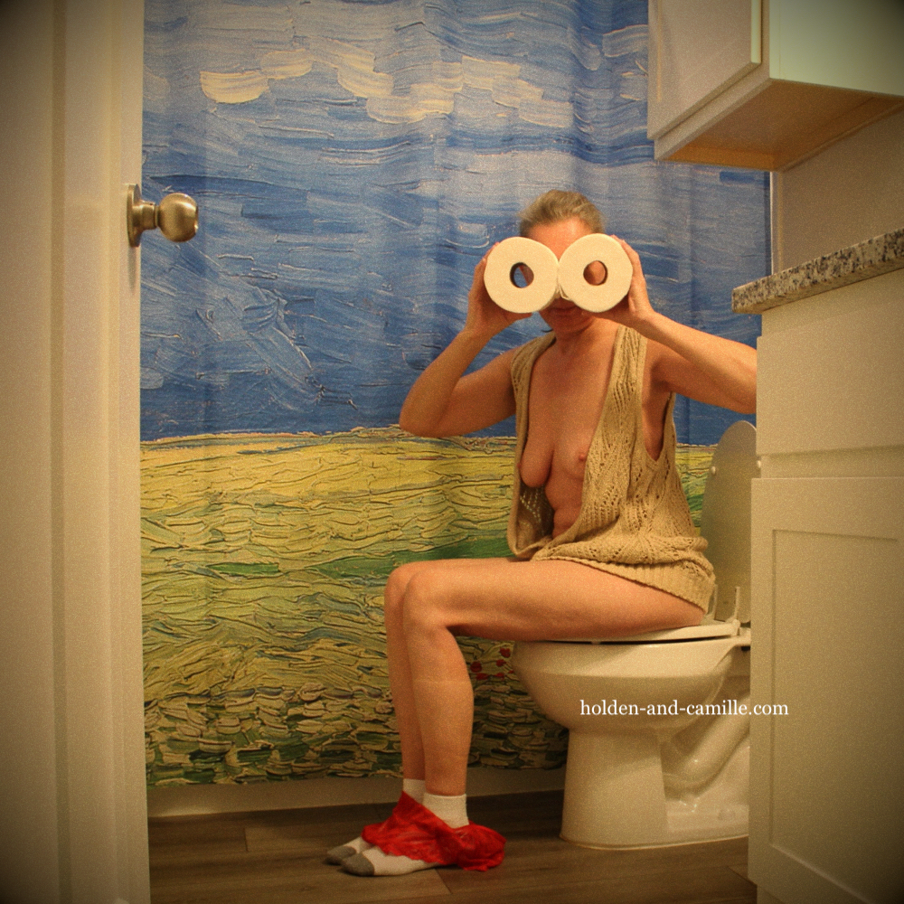 You may be asking yourself, “Did they conceptualize and shoot a whole-ass silly photo, just because they’re tickled with their new Van Gogh shower curtain?” Well, yes. Yes we did. Since we haven’t had any overnight guests, addressing the shower in the secondary bathroom has been pretty low on the priority list. We’d never so much as hung a naked rod up there. However, this might change soon, so we did a little shopping. This is a reproduction of Wheatfield Under Thunderclouds, but the site from which we ordered it had TONS of other options, too. And we have two of his framed prints on the wall next to the sink, so the curtain officially completes the Van Gogh Lavatory. Happy weekend, y’all! ~C