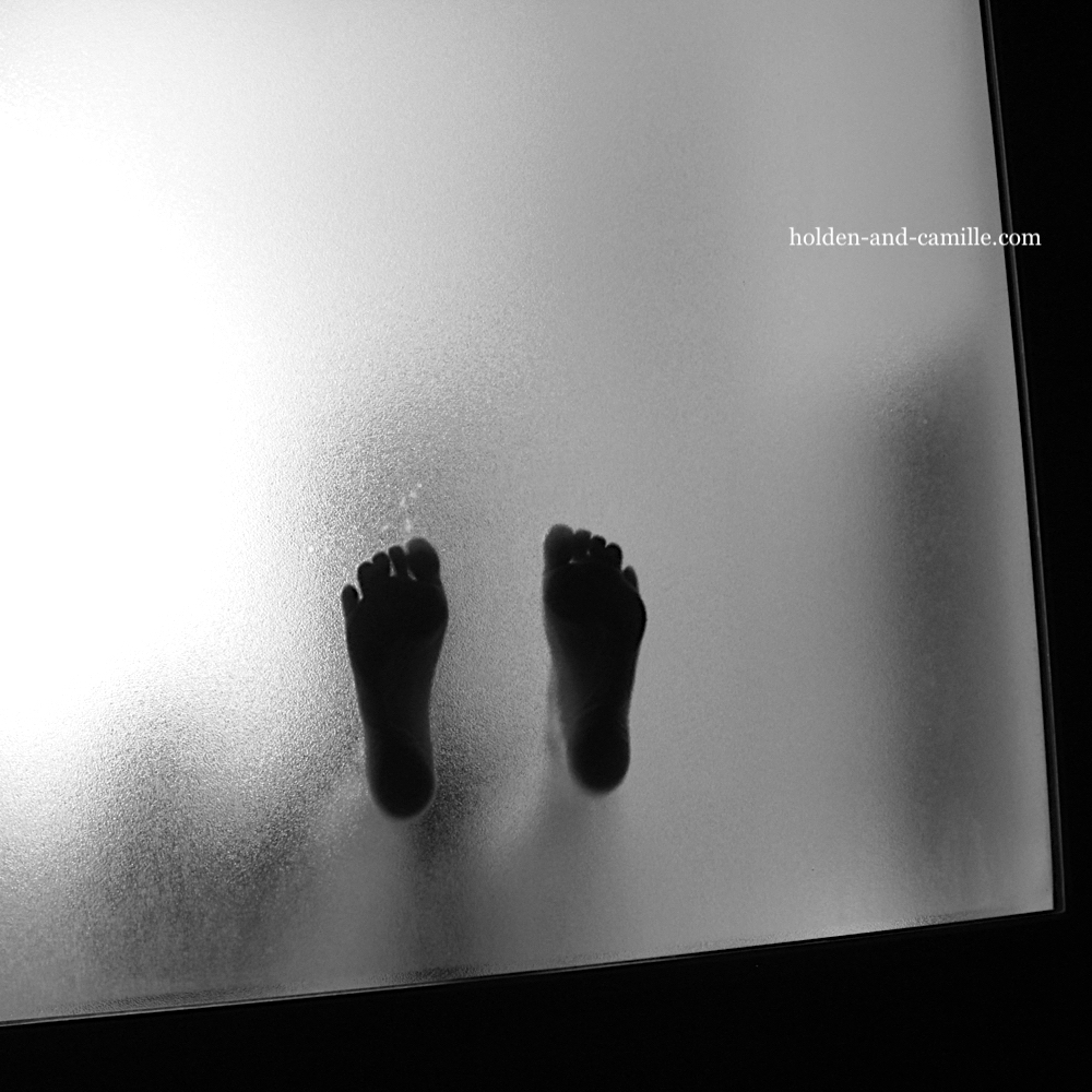 Here’s an idea that had been simmering for a while. We had only been living here a few weeks when Holden went out to the backyard after dark to move our garbage bin to the sidewalk for the next morning’s pickup. I was in the bathroom at the time, and he could make out the shadows of my movements in the opaque glass window above the bathtub. (The window as seen from the inside, for reference.) He wondered how close I would need to be to the window in order to be seen clearly from the outside, though bless his heart, he kept forgetting to test his theory until the days before our most recent photo session. And yes, before you ask: We will be posting shots with sexier body parts at the window soon…